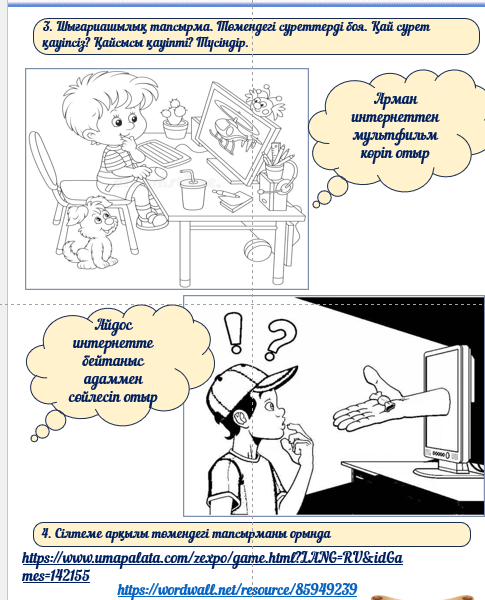 -интернеттегі қауіпті және қауіпсіз әрекеттерді анықтайды -сергіту жаттығуларын орындайды -шығармашылық тапсырманы орындайды -интерактивті тапсырманы орындайды |