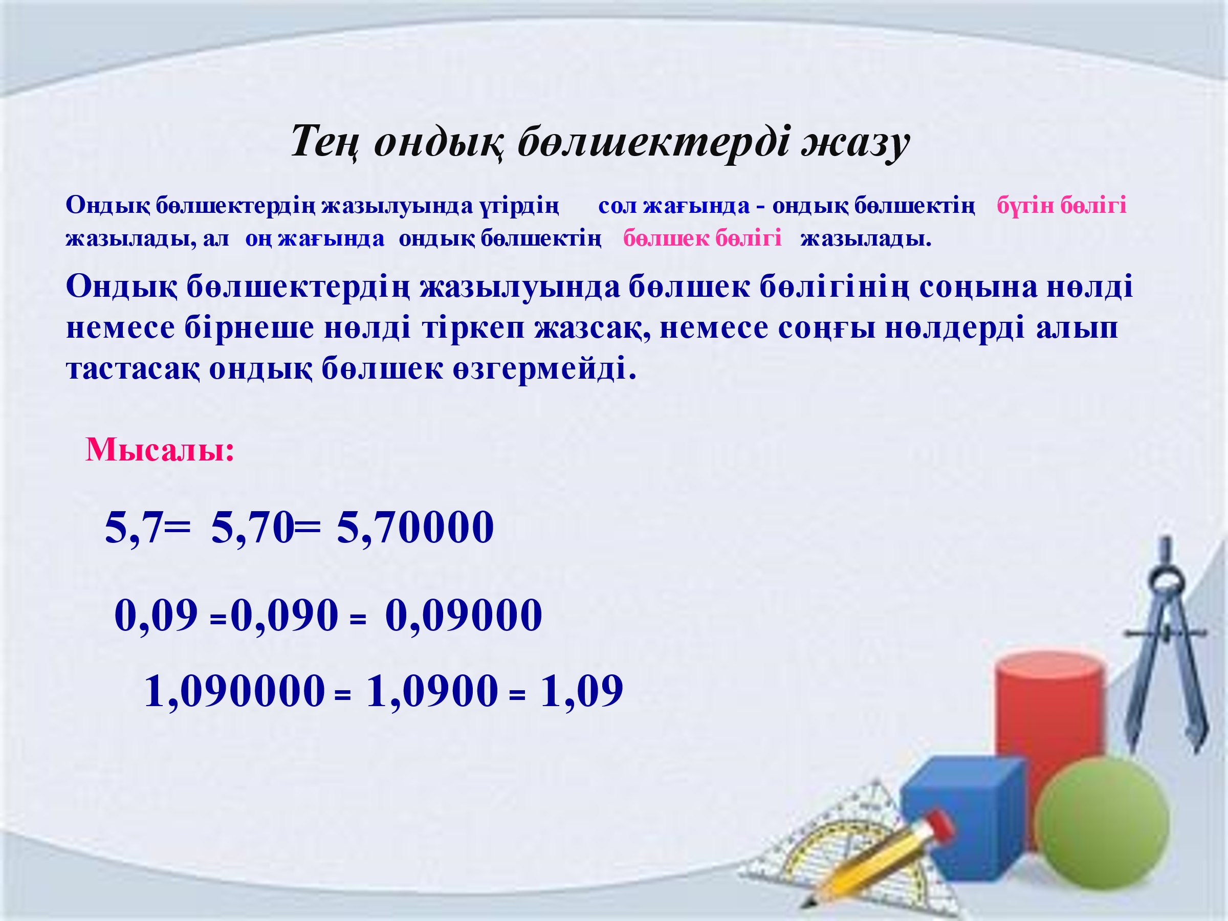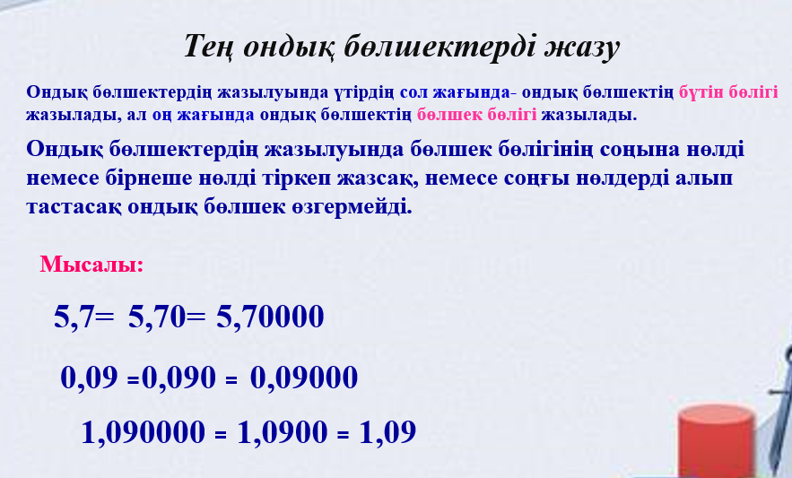 Ондық бөлшек. Ондық бөлшектерді оқу және жазу. Ондық бөлшекті жай бөлшекке айналдыру |