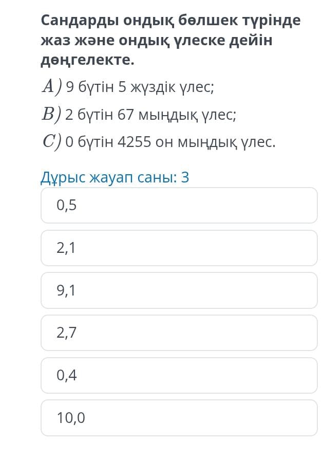 5.1.1.15 санның жуық мәні ұғымын меңгеру; 5.1.2.32 ондық бөлшектерді берілген разрядтарға дейін дөңгелектеу; |