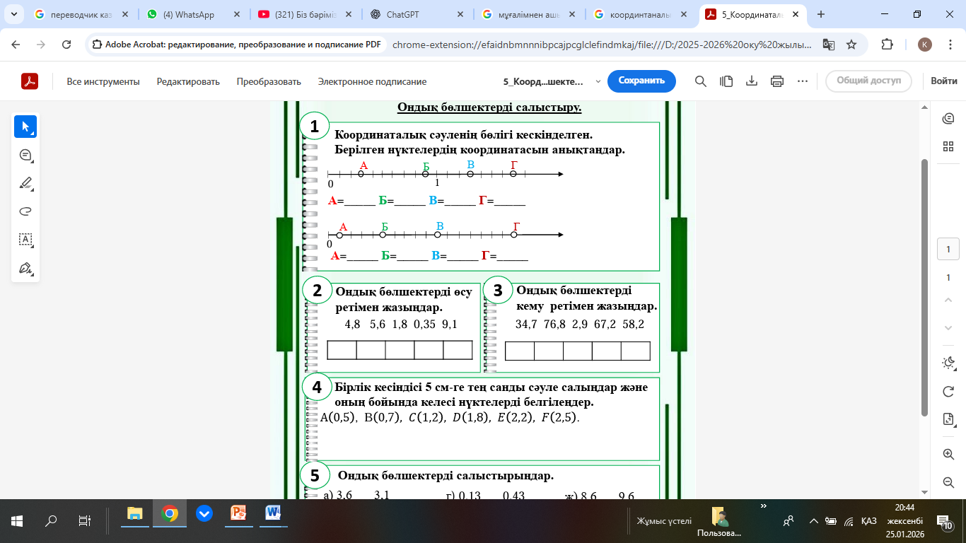 Дискрипторлар: -Координаталық сәулеге кескіндейді; -Ондық бөлшектерді өсу жіне кему ретімен жазады; -Координаталық нүктелерді белгілейді; |