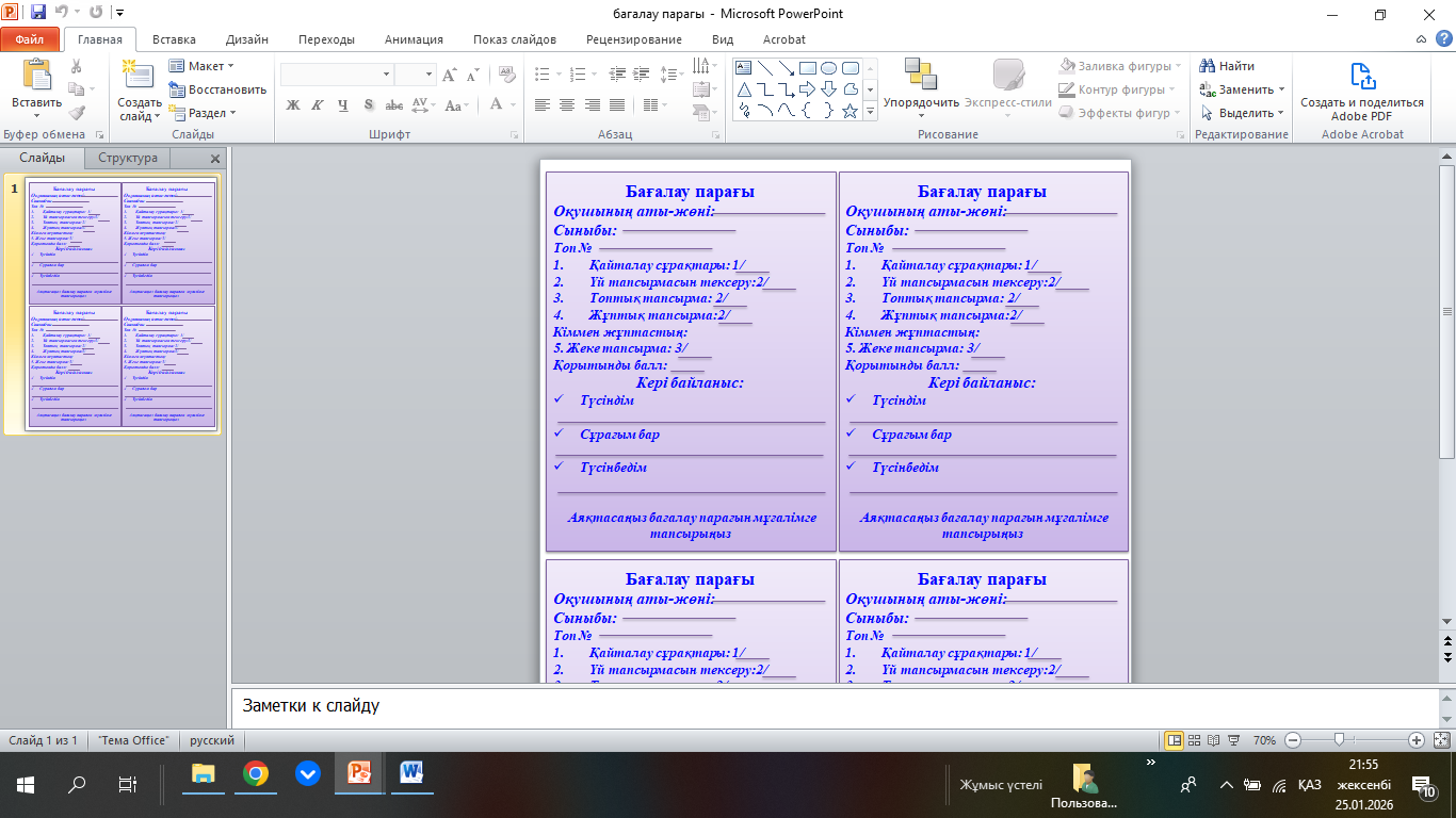 Жеке парақ, тақта, презентация, сызығыш |