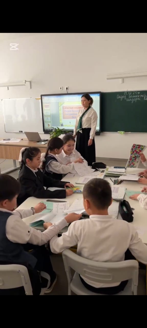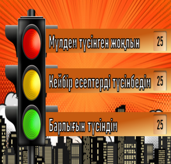 ҚБ: дескриптор бойынша Тақтаға 1 немесе 2 есепке шықса– 1 ұпай 3 пен 6 сұрақ арасында есеп шығарса –2 ұпай Дұрыс жауап берген оқушыларға мотивация беру үшін ауызша бағалайды. «жарайсың», «дұрыс», «өте жақсы» т.б. |