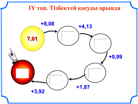 Оқушылар аукцион ережесіне экранда берілген сұрақтарға жауап береді, дұрыс жауап берген жағдайды қосымша бонустарға ие болады. Қате жауап жағдайында ақша шегеріледі. Команда банкирі бөлінген қаржыны дұрыс есептеп отыруы тиіс. Дескриптор: Білім алушы - ондық бөлшекті қосады; - ондық бөлшектерді қосудың тиімді әдістерін қолданып,есептер шығарады. |