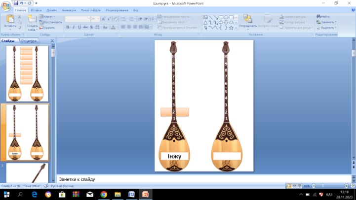 4. Талдау кезеңі (10 минут) Деңгейлік тапсырма Жеке жұмыс (топ мүшелеріне 4 нұсқада тапсырма беріледі, дәптерде орындайды) І нұсқа А. Теңдеудің түбірін тап: №643 18,08 – х = 10,7 Дескриптор 1.Белгісіз азайтқышты табады. 2.Ондық бөлшектерді азайтады. В. Өрнекті ықшамдап, оның мәнін тап: №644 20,1 + а + (5,38 +4,38), а = 0,098 Дескриптор 1.Өрнекті ықшамдайды. 2.Тиісті санды орнына қойып есептейді. С. №647 5,69 және 1,606 сандарының қосындысы мен 1,29 санының айырымы болатын өрнекті құрып, мәнін тап. Дескриптор 1.Өрнек құрастырады. 2.Өрнектің мәнін табады. Оқушылар орындап жатқанда қобыз туралы ақпарат беріледі. Қобыз – қазақтың ең көне аспаптарының бірі. Қобыздың мойны имек, шанағы ожау тәрізді қуыс, бет жағы ашық болады. Қобыздың ішегі мен садақ тәрізді ысқышы жылқының қылынан тағылады. |