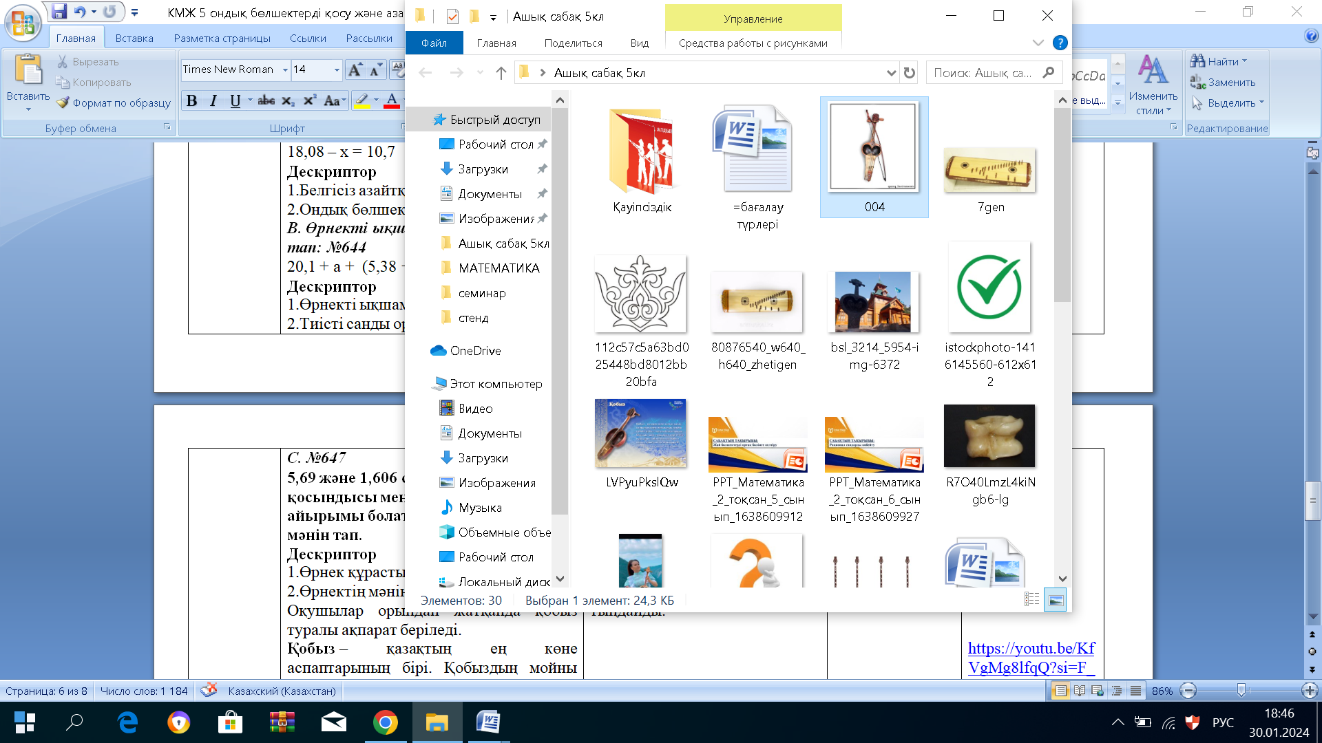 В. Өрнекті ықшамдап, оның мәнін тап: 20,1 + а + (5,38 +4,38) = 29,86 + 0,098 = 29,958 С. №647 5,69 + 1,606 – 1,29 = 6,006 Оқушылар орындап жатқанда қобыз туралы ақпарат алады. Қобызбен орындалған әуенді тыңдайды.