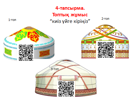 4-тапсырма. Топтық жұмыс Оқушылар киіз үйге кіру үшін оның есігінде тұрған QR кодты ашу керек. Яғни есептерін шығару керек