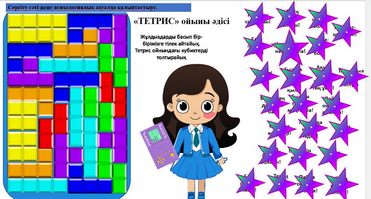 Әдіс: Сергіту сәті жене психологиялық ахуалда қалыптастыру. Оқушылардың бір-біріне жақсы көңіл күй сыйлауына жағдай жасап, жағымды психологиялық ахуал қалыптастыруды ұйымдастырады. Жұлдыздарды басып бір-бірімізге тілек айтайық. Тетрис ойнындағы кубиктерді толтырайық -сабақтың мақсатымен таныстыр
