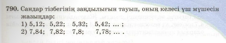 Дескриптор:Сандар тізбегінің заңдылығын тауып, оның келесі үш мүшесін жазыңдар. |