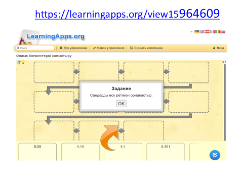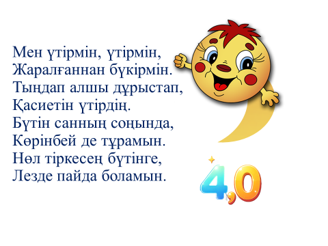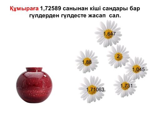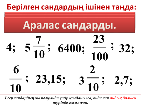 Өткен сабақты есіне түсіру ішін экранда көрсетілген сандар арасынан натурал сан, бөлшек сан және аралас сандарды ажыратады. Ондық бөлшек сандарды оқиды |