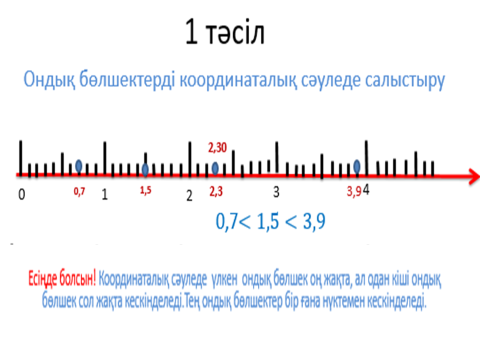 Оқушыларға жаңа тақырыпты түсіндіреді Тақырып: Ондық бөлшектерді салыстыруОндық бөлшектерді салыстыру — қай сан үлкен, қайсысы кіші екенін анықтау. Ол үшін біз үш қарапайым қадамды қолданамыз. 1-қадам: Бүтін бөлікті салыстыруОндық бөлшектің үтірдің сол жағындағы саны — оның бүтін бөлігі. Ереже: Мысал: