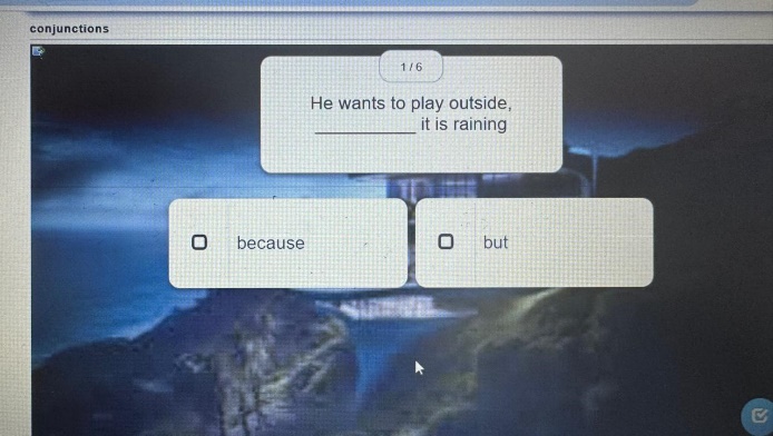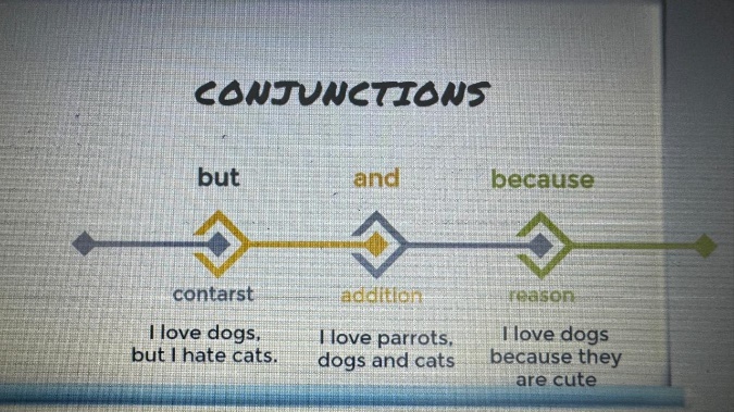 Activity 6. Introducing the use of Conjunctions: and, but and because. Then doing an interactive exercise on the LearningApps.org platform We use but to contrast two ideas We use and to give additional information We use because to give a reason