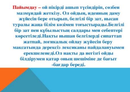 Мәтіндегі негізгі және қосымша ақпаратты анықтайды; Қандай мақсатта, не үшін қолданғанын түсінідіреді; Өмірдегі кейбір жағдаяттармен байланыстырып, нақты мысал келтіреді. |