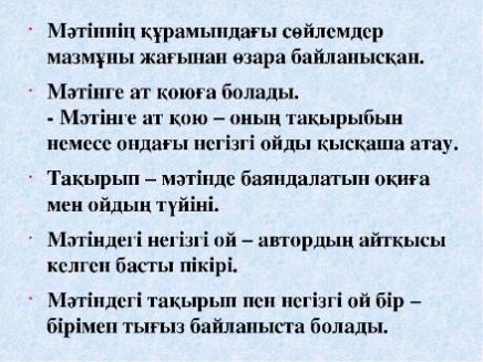 -Мәтіннің қандай түрлері болады? -Мәтіннің тақырыбын қалай ашуға болады? -Ал мәтіннің идеясы деген не? |