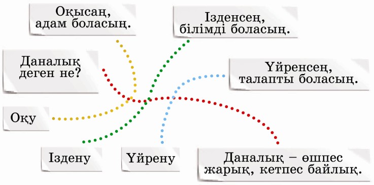 Өлеңді шумақтарға бөліп оқыту. Тірек сөздердің көмегімен әр шумаққа тақырып қой. Оқулықта бұл сөздер қара түспен берілген. Оқу Жұмыссыз Даналық – өшпес жарық, кетпес байлық Сергіту сәті. «333 жаттығуы» 3 минутта сабаққа қатысты 3 сөз, 3 сөйлем айту. Қалыптастырушы бағалау (ҚБ) ретінде орындатуға болады. Топтық жұмыс. 1-тапсырма. Әр топ берілген сөздерден бастала- тын сұрақтар құрастырады. Оқу Іздену Үйрену