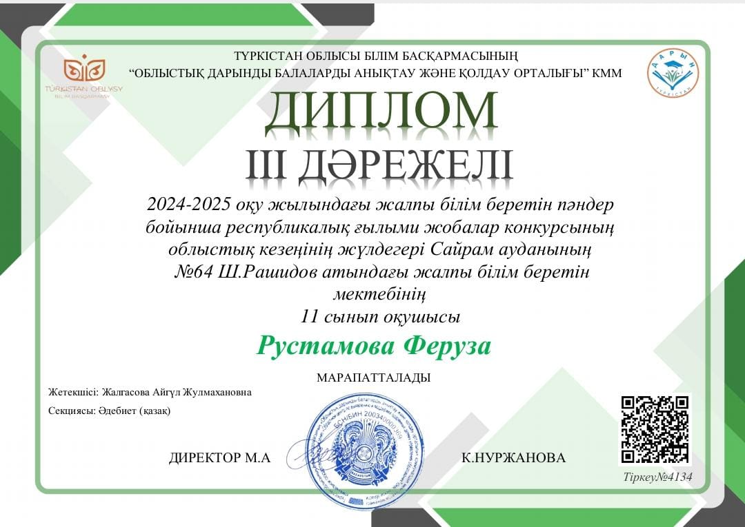 Сайрам ауданы №64 Ш.Рашидов атындағы жалпы білім беретін мектептің «Жас ғалым» атты дарынды оқушылармен атқарылатын жылдық жұмыс жоспары