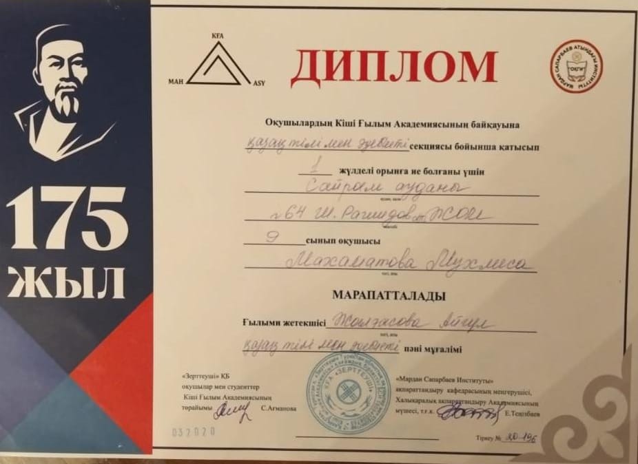 Жыл сайын білім беретін пәндр бойынша мектеп оқушылары республикалық ғылыми жобалар конкурсына қатысып, жүлделі орындарды иеленіп жүр