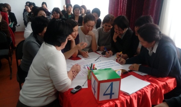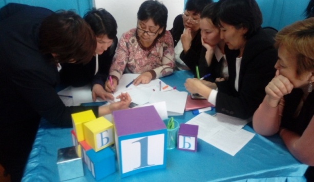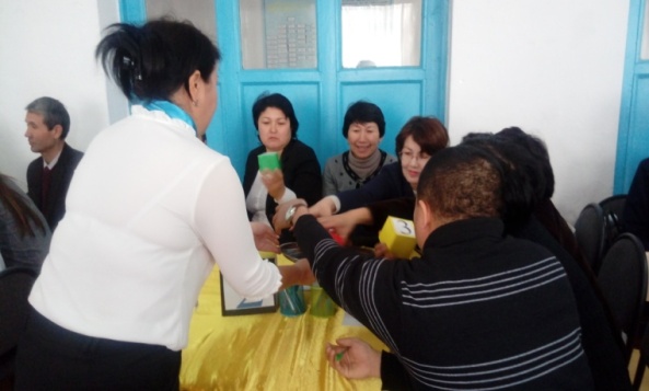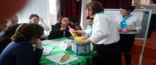 1.Әр мұғалім 1-ден 4-ке дейінгі сандар жазылған текшелерді алып, белгіленген орынға барып отырады.