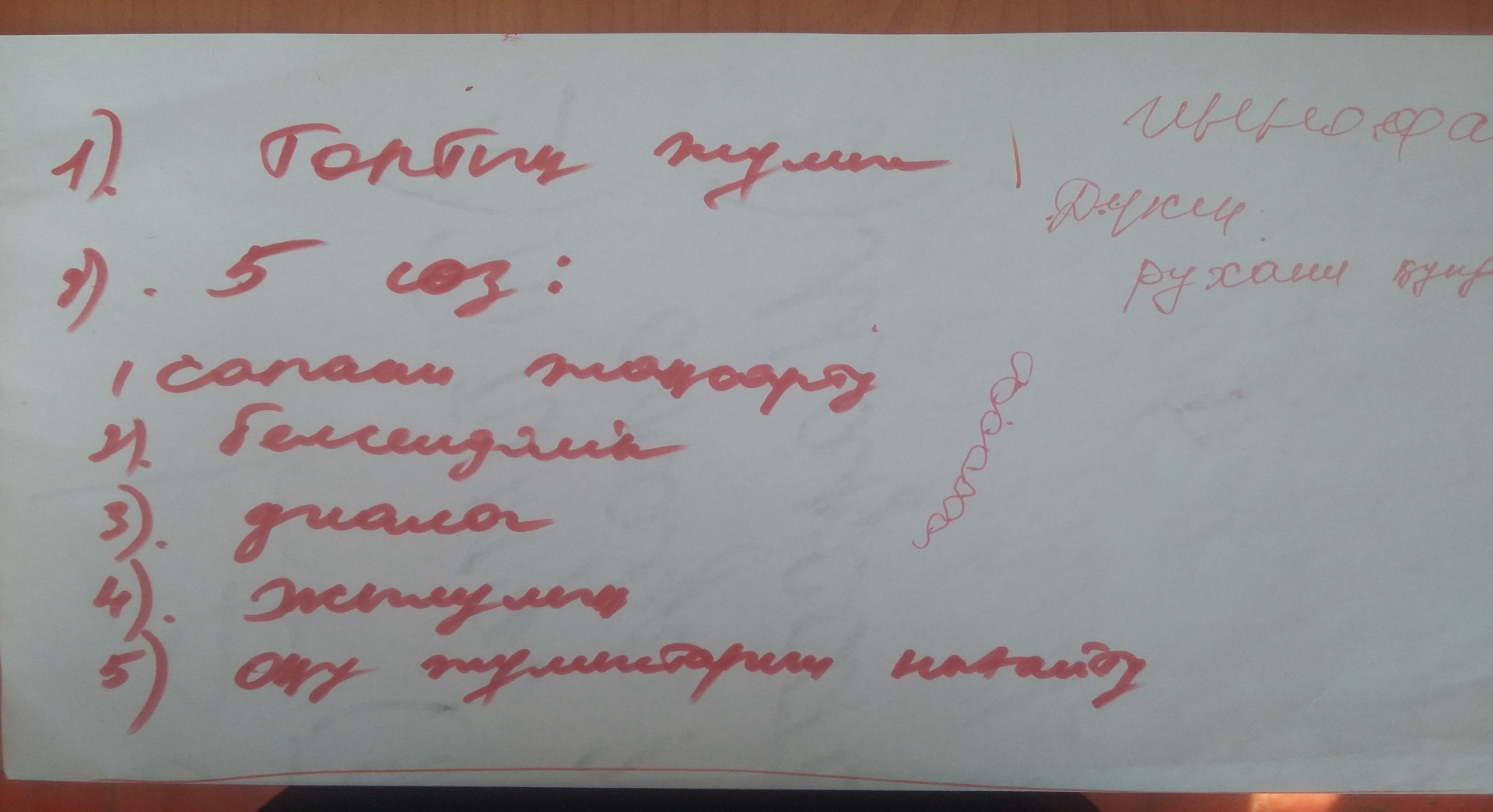 Құпия сөздер: Қаламсап,кітап,тақия,орамал, секіртпе, доп,әмиян.