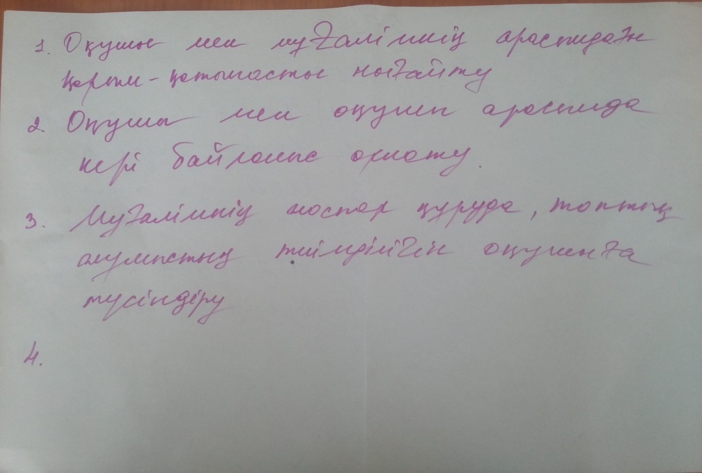 Барлығы –топтық жұмыстың мықты жақтары,әлсіз жақтары туралы айтады Сайлау- « 30 жылдан кейін мұғалім, оқушы, ата – ана қандай болады?» сұрағына жауап береді. (өздері ортадан жауап беретін бір адамды сайлайды)