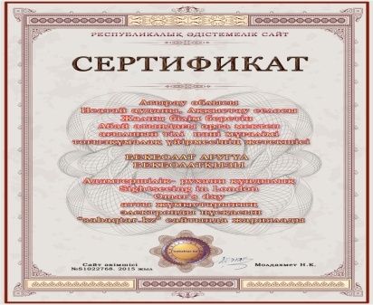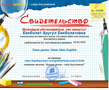 Осы әдіс- тәсілдерді қолданып өткізген " Sightseeing in London", " Omar's day" сабақтарымды республикалық "sabaqtar.kz" сайтына жіберіп, "сертификат" және "құрмет грамотасымен", "sabaq.kz" сайтына "My future profession" атты сабағымды жіберіп сертификат және алғыс хатпен марапатталдым. Және " Копилка уроков- сайт для учителей" республикалық сайтқа " Omar likes English" сабағымды жіберіп сертификат алдым.
