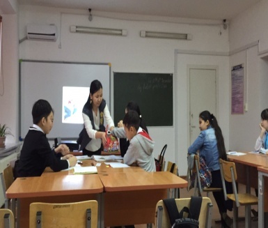 Мысалы: 5- сыныпқа What do you eat for breakfast? тақырыбында өткен сабағымда 3- топ "At the cafe", " At the shop", "At the hotel" тақырыптарына диалог құрастырып, рольге бөлініп, ойнады.