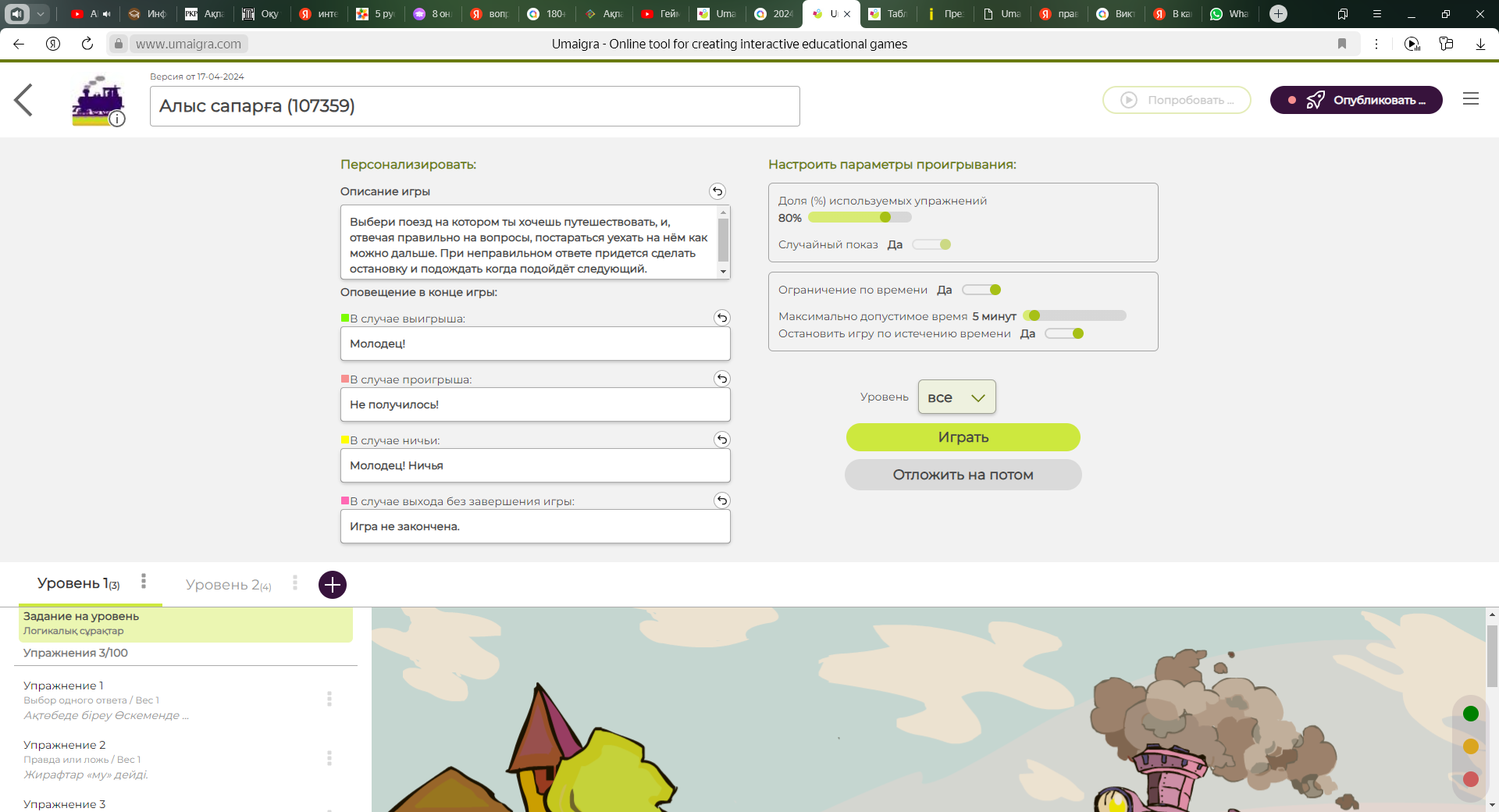 «Сядь на поезд» шаблоны таңдалды. Шаблондарды таңдау барысында шаблондарда құрастырылатын тапсырма, сұрақтардың сипаттамасы беріледі. Сонымен қатар оң жақ бөлігінде осы шаблонға байланысты дайын мысал келтірілген, сонымен қатар жаңадан ойын құрастыру батырмасы бар. Барлық сұрақтардың еңгізіп деңгейлер бойынша бөліп, «бөлісу» батырмасын басамыз. Төменде көрсетілген параметрлерлі еңгіземіз. Сурет 7