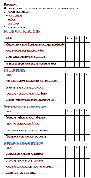 – өзін-өзі реттеу қабілетін бағалау сауалнамасы;