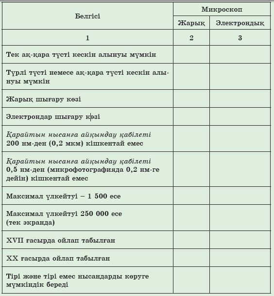 2. Электрондық және жарық микроскопын салыстырыңдар. Сәйкес бағанға