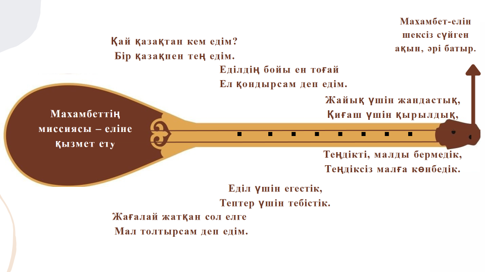 Домбыраның шанағына - Махамбеттің миссиясы– еліне қызмет ету деп жазылады.
