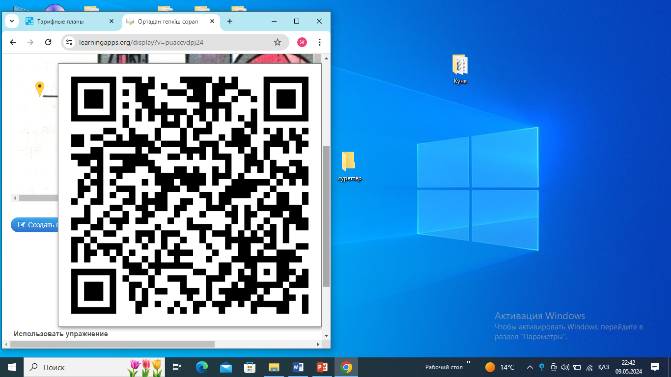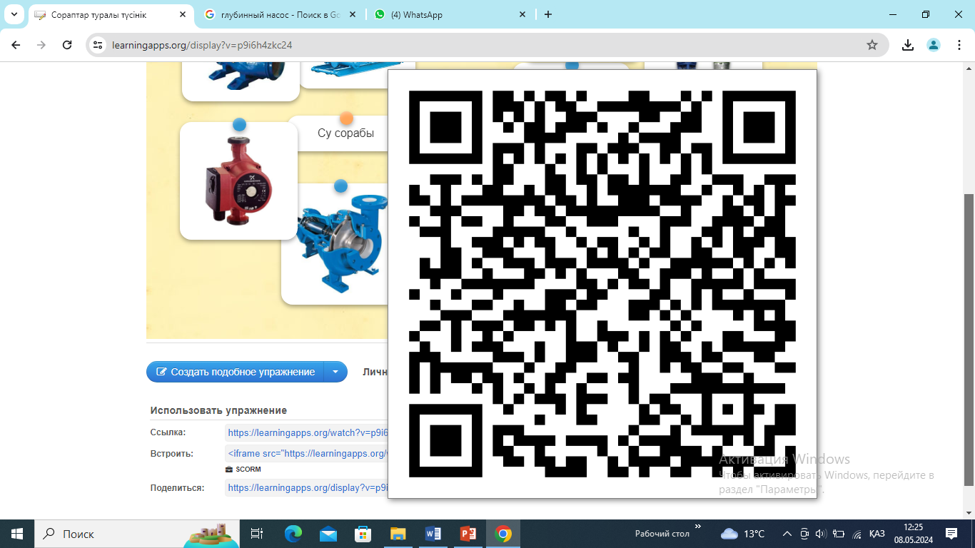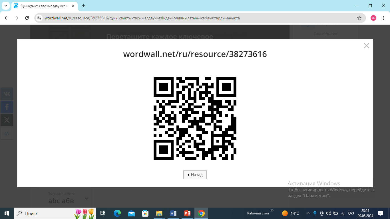 Wordwall сервисінде орындалады https://wordwall.net/ru/resource/38273616 сілемесіне немесе QR кодты сканерлеу арқылы мобильді телефонда тапсырма орындайды |