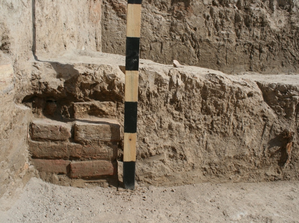 Одан кейін осы қазбаның солтүстік-шығыс бөлігінен оңтүстік-шығысқа қарай бағытталған, жақсы сақталған пахса блоктарынан жасалған дуал қабырғасы табылып тазаланды. Мықты дуал қабырғасының қалыңдығы-1 м., пахса блоктарының ұзындығының көлемі 1,5м., сақталған биіктігі – 60-70 см (6-7 суреттер). Бұл дуал қабарғасының оңтүстік-шығыс жағы қазба жиегіне кіріп жатқандықтан жалпы ұзындығы белгісіз болып отыр. Пахса блоктарының сыртында слағы сақталған, оның сақталған қалыңдығы 2-3 см. Осы пахса блоктан қаланған қалың дуалдың астында 2-3 см. болатын аппақ қамыс төселгені белгілі болды. Сонымен қатар қалың пахса блоктарынан қаланған дуалға паралелль батысқа қарай 07-09 м. жерден екінші тағы да бір дуал қабарғасы анықталды. Екі дуал қабырғасы да бір еден деңгейінде жатыр және екеуі де бір бағытқа қарай бағытталған бірақ екеуінің жасалыну қоспалары екі түрлі. Екінші дуал қабырғасының қалыңдығының ені- 0,9 м.-1м, сақталған биіктігі – 40 см, жұмбаздалып жасалынған дөңгелек формада қаланған кесектердің өлшемдері 42х22х12. Екінші дуал қабырғасының ұзындығы-.., нашар сақталған қабырға дуалы солтүстік-шығыстан оңтүстік-шығысқа қарай бағытталған (8 сурет).