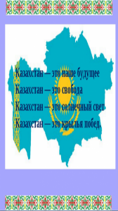 Казахстан — большая и красивая страна. Здесь живут добрые и трудолюбивые люди. В Казахстане высокие горы, широкие степи и глубокие озёра. Люди любят свою Родину, берегут природу и уважают традиции