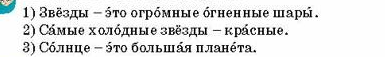 загадку и отгадывают ее. Возможный ответ: 1.Солнце. 2.Звезды. Учащиеся просматривают видео и пересказывают, что запомнили. Учащиеся слушают текст, отвечают на вопрос «Что нового узнали?» Придумывают заголовок. Учащиеся читают текст и рассказывают, что нового они узнали. Учащиеся находят верные утверждения и читают их. Учащиеся читают текст, отвечают на вопросы Выразительно читают текст. Отвечают на вопросы Объясняют значение новых слов и выражений. Учащиеся мальчики, девочки читают в энциклопедии информацию о Млечном Пути, о Солнце рассказывают одноклассникам |