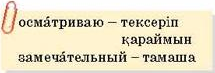 Учащиеся слушают стихотворение Ескена Елубаева. Учащиеся обсуждают в группах о пользе молока. Учащиеся рассматривают постер и рассказывают, что нового они узнали. Учащиеся вставляют в предложения слова- признаки Учащиеся пишут в тетради правильно предложения с предлогами проверяют, как выполнил(-а) работу одноклассник(-ца). |