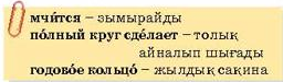 Учитель предлагает прослушать сказку и ответить на вопросы: Прием « Видеозарисовка» ГР 1. Назовите главных героев. 2. Кто из них прав? Почему? Текст Год состоит из четырёх времён года: зимы, весны, лета и осени. После зимы приходит весна. Затем наступает лето. После лета приходит осень, а потом снова зима. Так времена года повторяются каждый год. Поэтому говорят, что год круглый. Функциональная грамотность. Сколько времён года в году? Что приходит после лета? Почему год называют круглым? Расположи времена года по порядку. Назови любимый месяц и объясни почему. |