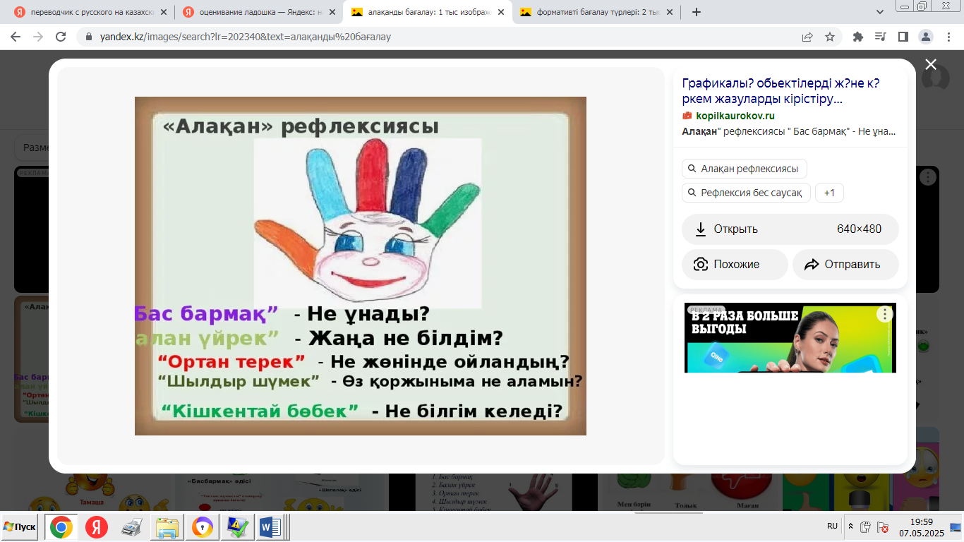 - «Мадақтау және қолдау» ойыны: әрқайсысы екіншісінің өнімділігі туралы оң пікір айтады. -Сабақтың қорытындысы: «Ең жақсысы не болды?», «Нені жақсартуға болады?» - «Менің жобаны қорғау тәжірибем» кері байланыс. - Үй тапсырмасы: жоба туралы қысқаша есеп дайындаңыз. |