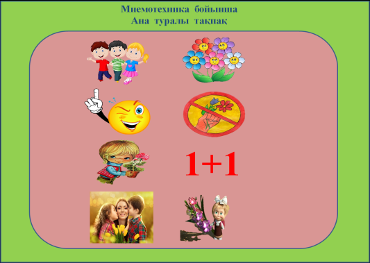 Анаға байланысты тақпақты мнемокесте бойынша оқиды. Балалар тест тапсырмаларын орындайды. |