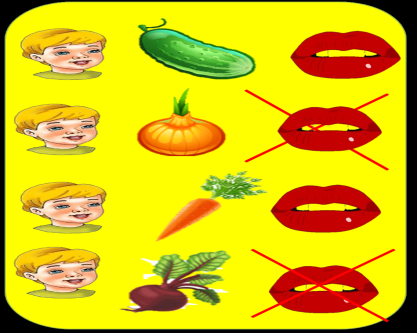 балалар жемістер мен көкөністердің түстерін ажыратып,пішіндердің түсімен сәйкестендіру. Балалардың жауабы тыңдалады. Ата, әже, әке, ана, аға,апа,іні. Отбасы жайлы мнемокестемен әңгіме құрастырады.