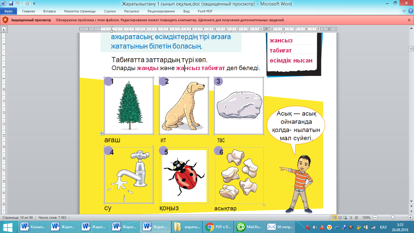 Жанды — жансыз Оқушылар суреттерде салынған жанды ағзалар мен жансыз заттарды ажырата алады. Жұмыстың дұрыс орындалуын бақылаңыз. Егер оқушыға тапсырманы орындау қиынға соқса, онда оған көмектесіңіз. Сонымен қатар тапсырманы тез, нақты әрі қатесіз орындаған оқушыларды ерекше атап өтіңіз. Тапсырманы орындай алмаған оқушылар кездессе, оның себебін анықтап, сабақ тақырыбын тағы да түсіндіру қажет. Жауабы Жанды: ағаш, ит, гүл, қоңыз, құс. Жансыз: сағат, тас, су, үстел, асықтар, домбыра,