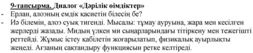 9-тапсырманы орындатады. Қаратпа, қыстырма, одағай сөздерді пайдаланып, «Дәрілік өсімдіктер» тақырыбында диалог құрыңдар.