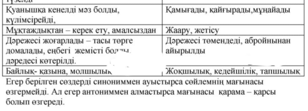 Дескриптор: - Синоним сөздерді тауып жазады.1 -Антоним сөздерді тауып жазады.1 -Мағынасына мән береді 1 Жалпы: 3 ұпай (4 ұ)
