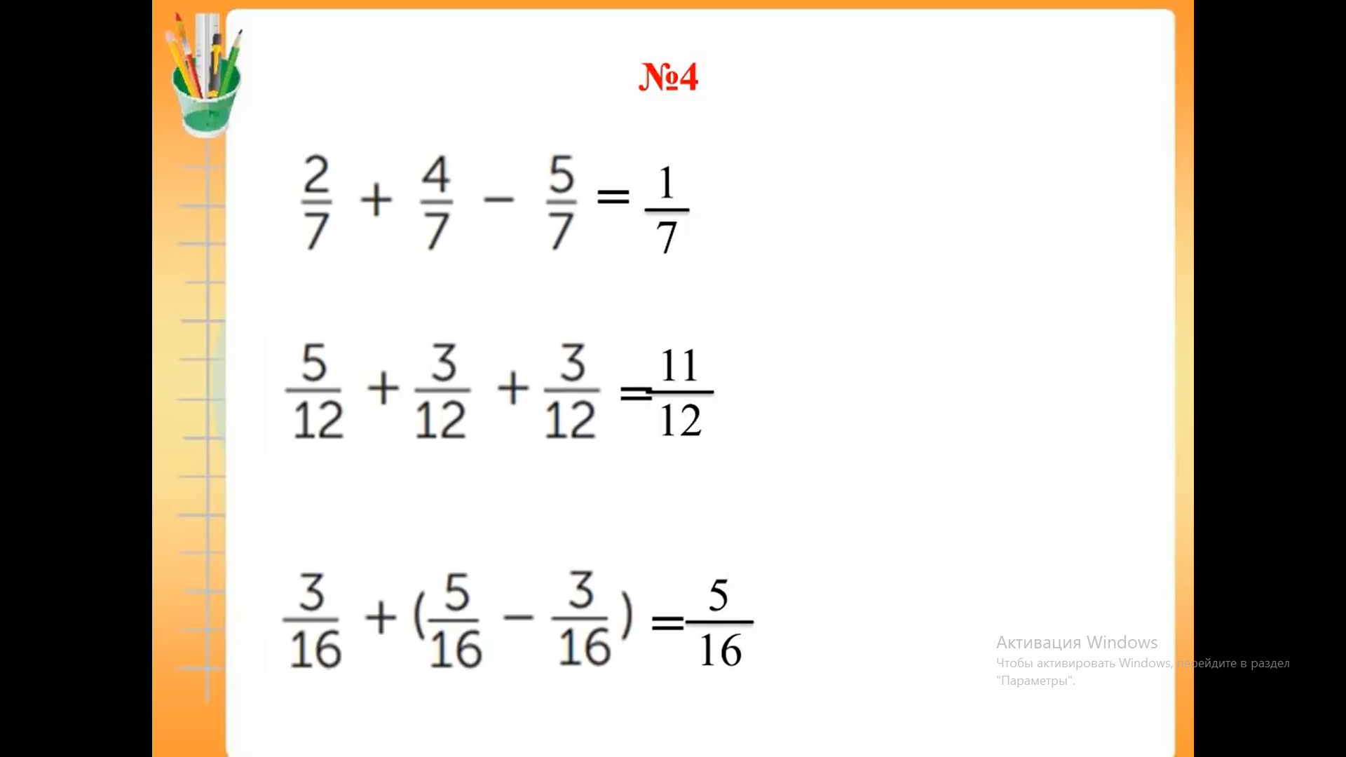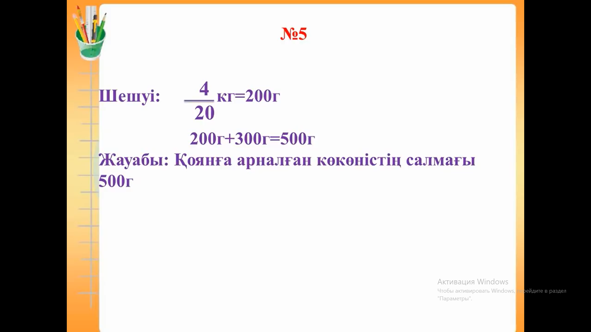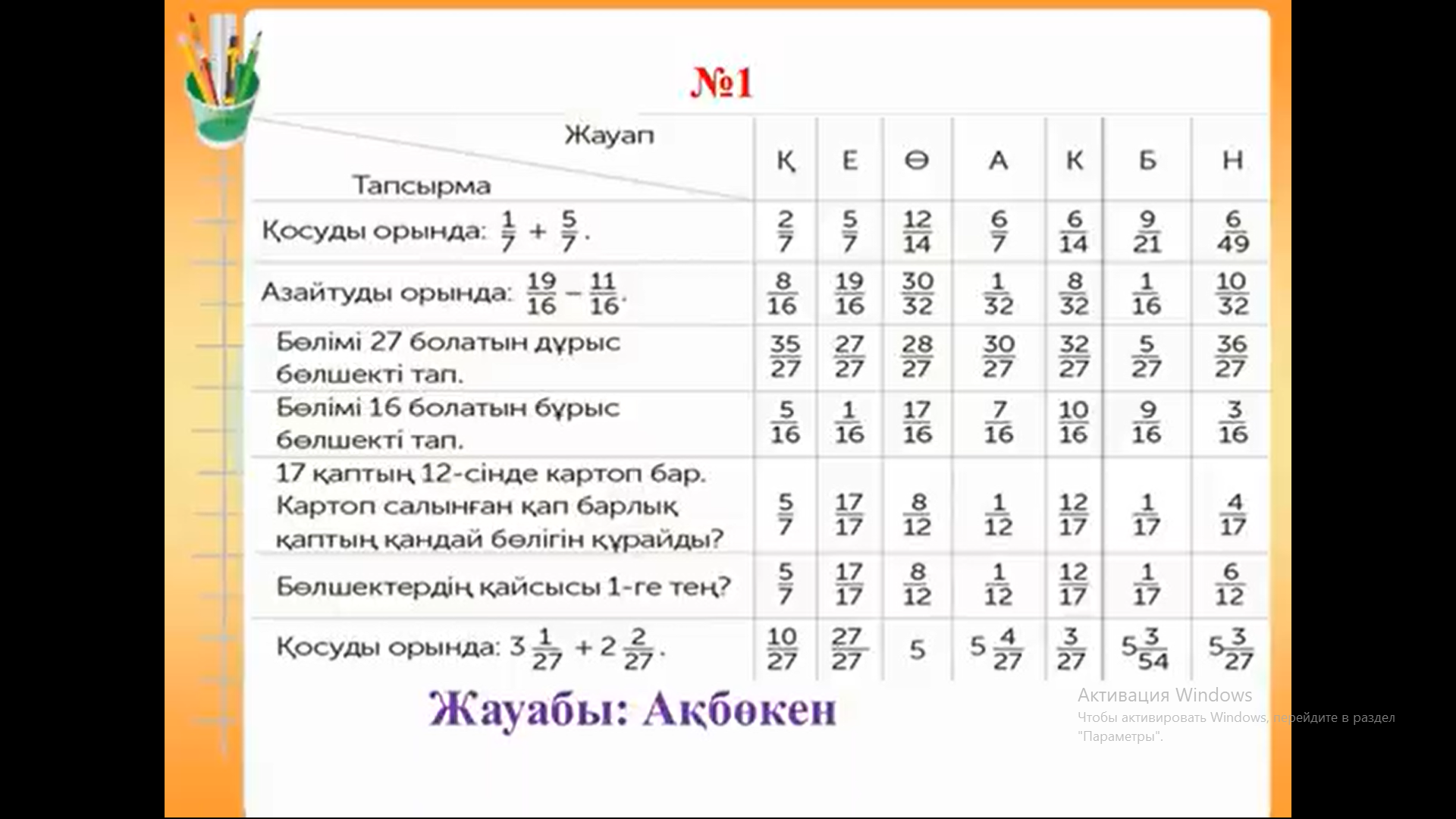 ҚБ: Мұғалімнің ауызша бағалауы үздіксіз жүріп отырады. Дескриптор: -бөлшектердің мәнін табады; -кему ретімен орналастырады; -есептің жауабын жазады ФБ-3 балл Дескриптор: -бірінші тапсырманы дұрыс орындайды; -екінші тапсырманы дұрыс орындайды ФБ-2 балл Дескриптор: -бірінші бөлшекті өрнектің мәнін дұрыс есептейді; - екінші бөлшекті өрнектің мәнін дұрыс есептейді; - үшінші бөлшекті өрнектің мәнін дұрыс есептейді; ФБ-2 балл Дескриптор: -есептің шартын құрады; -есептің сұрағын анықтайды; -есептің шешуін табады; -есептің жауабын жазады; ФБ-4 балл Дескриптор: -сандық ресурсты қолданады; -тапсырмаларды дұрыс орындайды ФБ-2 балл |