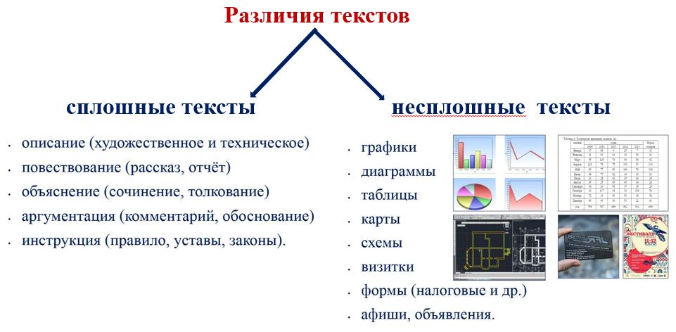 Во-первых, объяснить учащимся различие двух разновидностей сплошных и несплошных текстов с примерами. Это очень хорошо видно в данной ниже схеме.