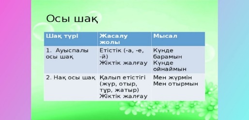 2-Тапсырма Нақ осы шақ пен ауыспалы осы шақтарды ажырата біліп, осы шақ және нақ осы шаққа бес мысалдан жазыңыздар. |