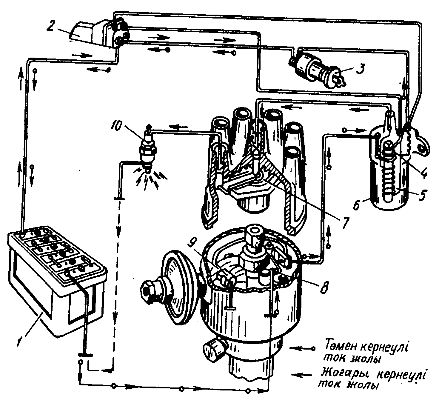— алғашқы орам, 5 —екінші орам, 6 — оталдыру катушкасы, 7 —тараткыш, 8 — үзгіш, 9 —конденсатор, 10 — оталдыру свечасы