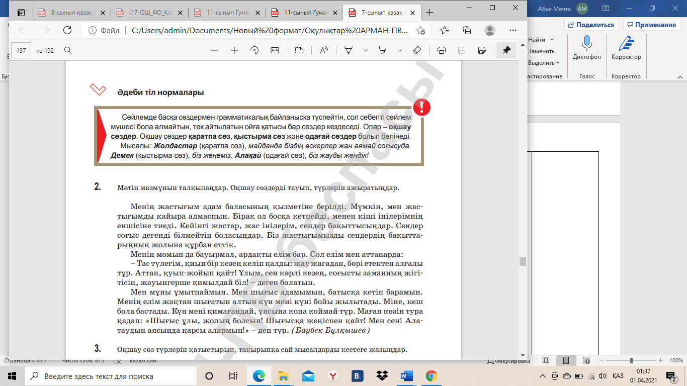 7.1.4.1. Мәтін тақырыбы, сөйлеушінің дауыс ырғағы мен сөйлеу мәнері арқылы негізгі ойды анықтау. 7.4.4.5. Оқшау сөзердің қызметін түсіну, ажырата білу. |