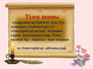 Кәнеки, өзіміздің шаттық шеңберімізде тұрып, Махаббат періштесі сыйлаған «сиқырлы таяқшаны» бір-бірімізге бере отырып, жақсы сөздер мен игілікті тілектер айтайық. Осы таяқшаның көмегімен біз мейірімді сиқыршыға айналамыз. Балалар, мен өзімнің тілегімді бірінші айтайыншы: