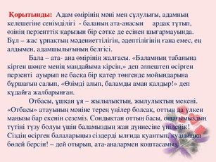 Дәйексөз. «Ұяда не көрсең,ұшқандасонныілесің» Халық мақалы Дәйексөзді жазғызу, оқушылардан жатқа сұрау. Түйін: Адамға өмірде ең қымбаты- отбасы. Отбасында сүйіспеншілік, сыйластық, татулық, бауырмалдылық болғанда бірлік болады. Бір-бірін аялап, кешіре , түсіне білгенде отбасы берік болады. Мұғалім. |