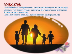 Сабақ мақсаты: -Оқушыларғаотбасытуралытүсініктерінкеңейтеотырып, сүйіспеншілікқұндылығыныңмәнінашу. Міндеттері: -Оқушыларғаотбасыұғымынмейірімділікқасиетіменбайланыстраотырыпұғындыру. -Отбасындағы өзара сыйластыққа үйрету арқылы қамқорлық қасиетіне баулу. -Оқушылардыотбасынқұрметтеуге ,татулыққатәрбиелеу. |