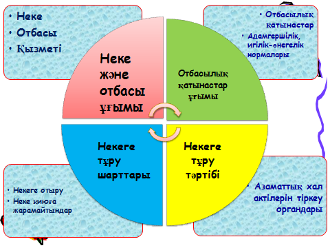білімдік: Оқушыларға отбасы құқығы, қайнар көздері, қағидаттары, некелесу, некені бұзу, отбасындағы ерлі-зайыптылардың, балалардың құқықтары мен міндеттері, неке шарты туралы түсіндіру.